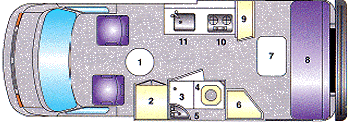 8. Electric Sofa Bed 9. Pantry 10. Range/Fridge Below 11. Sink |